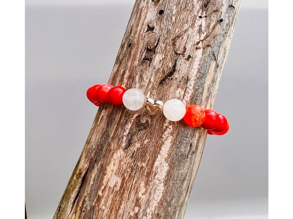 Náramek je tvořen Achátem červeným, bílým jadeitem a kovovým srdíčkem.
