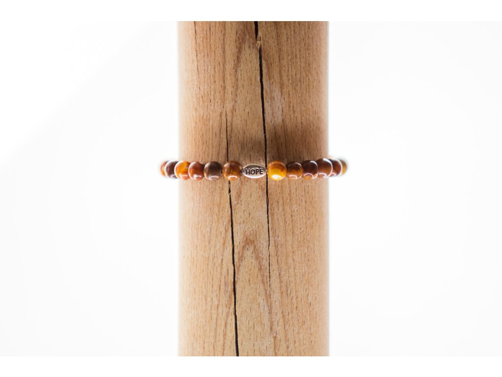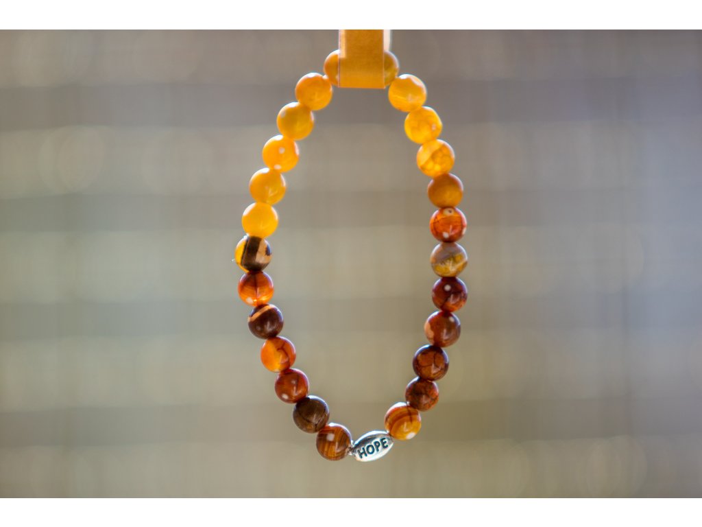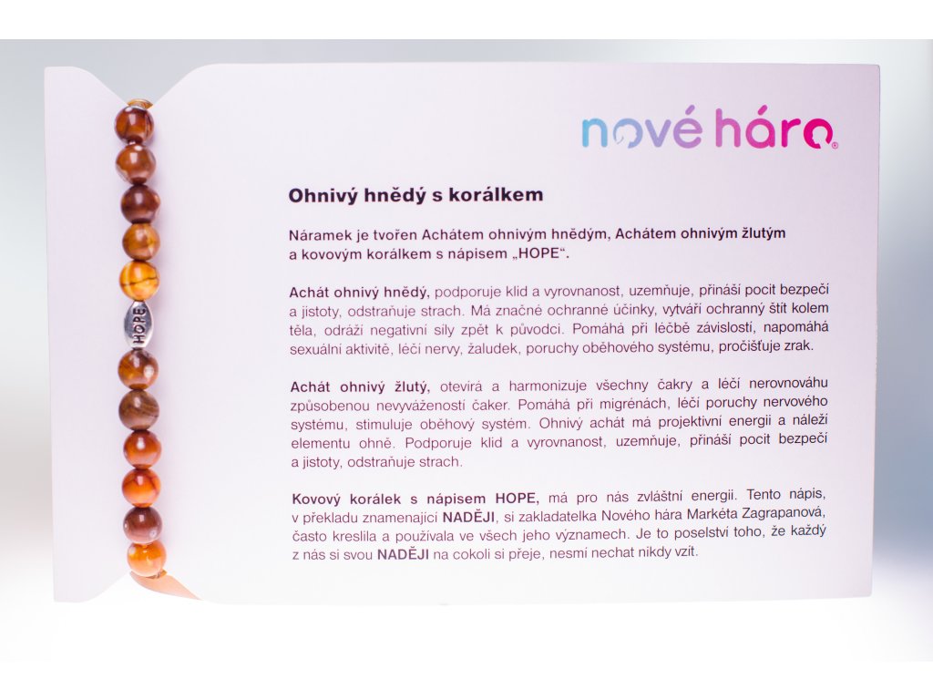 Náramek je tvořen Achátem ohnivým hnědým, Achátem ohnivým žlutým a kovovým korálkem s nápisem „HOPE“.