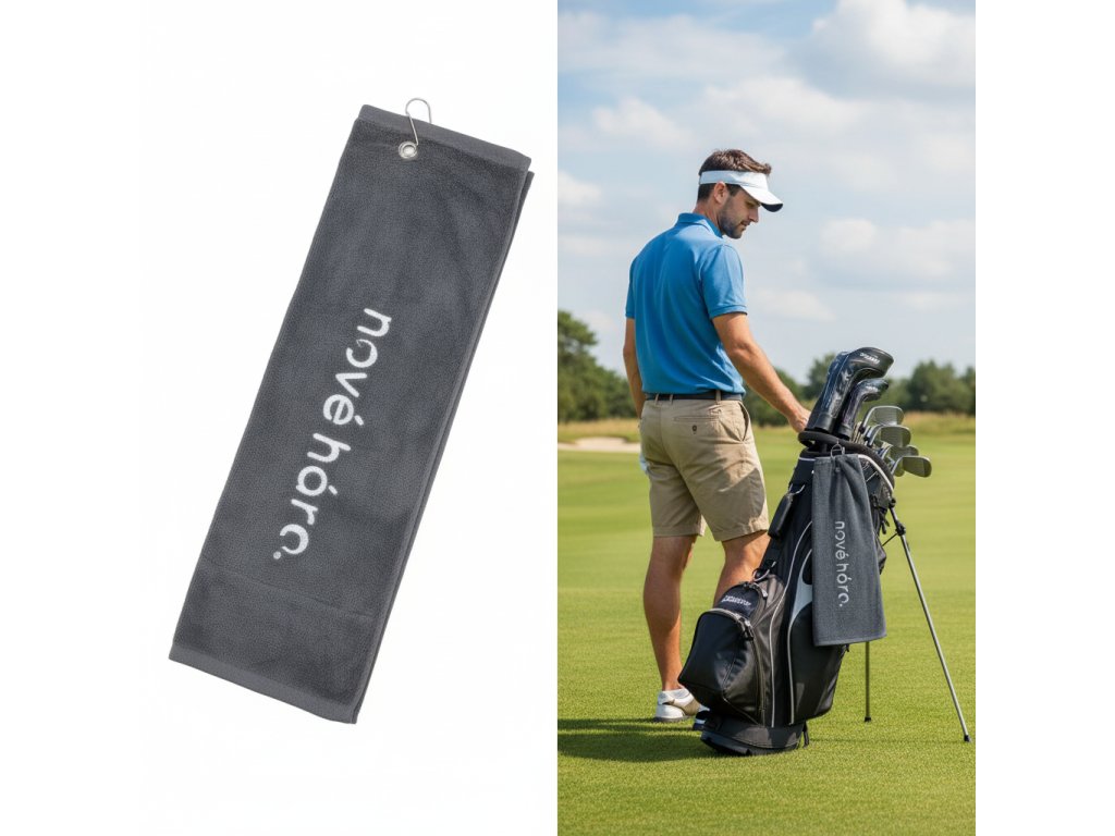 Praktický sportovní doplněk v elegantní šedé barvě, ideální pro každého golfistu. Tento golfový ručník s vyšitým logem nové háro kombinuje kvalitní materiál, vysokou savost a podporu dobré věci. Díky kovové karabině ho snadno připnete ke svému bagu.